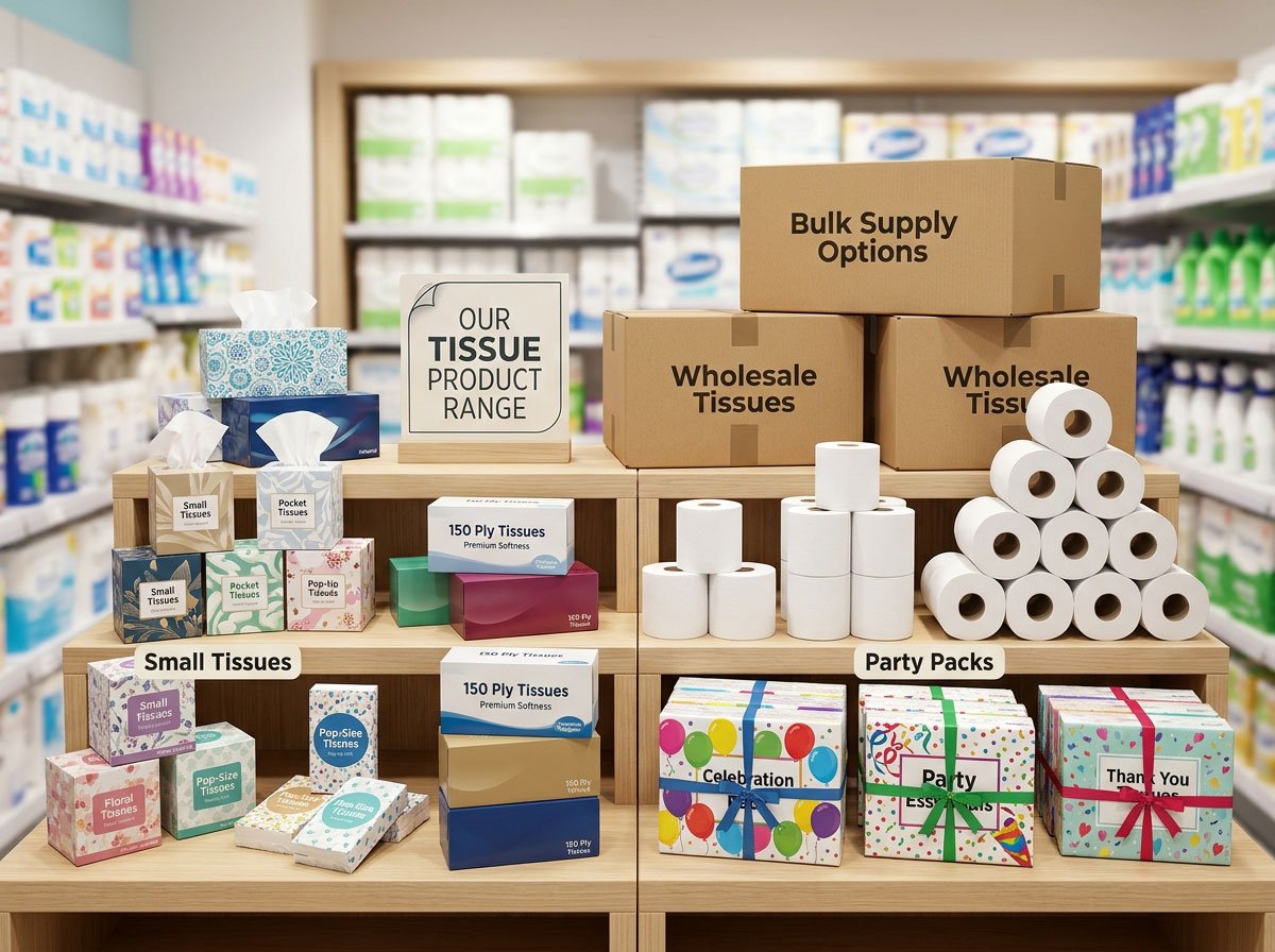Custom branded tissue boxes in small, pop-size, medium, and large formats.